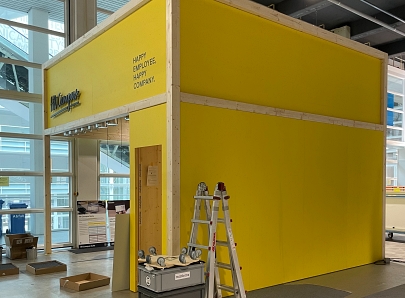 Ein super spannendes Projekt konnten wir für HR Campus umsetzten. Dieser Messeholzbau passte perfekt zu uns! Denn wir lieben das Bauen mit Massivholz. Auch die Entwicklung der Mechanik ist sicher nicht alltäglich. Über Seile mit Kessel als Gegengewichte sind die Informationstafeln nicht nur schnell einsatzbereit, sondern ein Hingucker für vorbeigehende Besucher.